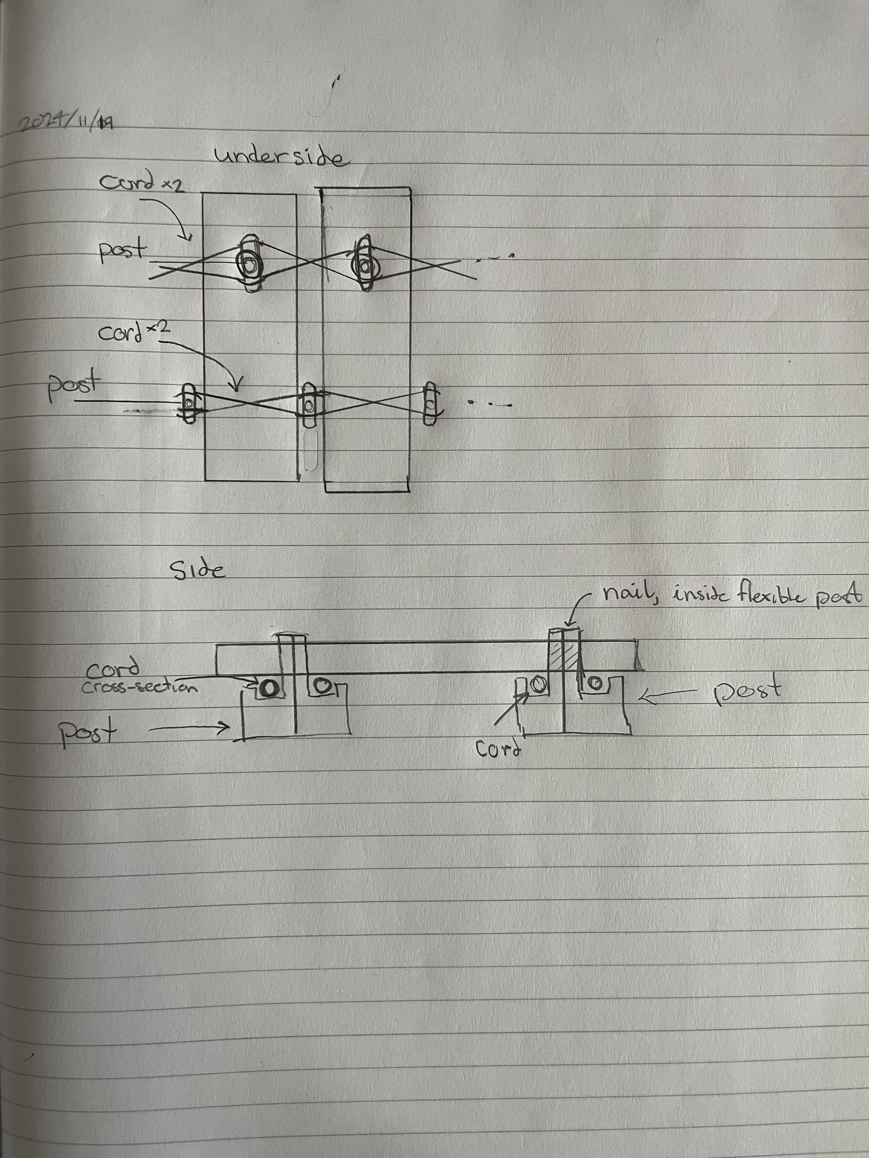 With this suspension system, the rear post hole can be drilled exactly at the node, which is the optimal placement to maximise sustain. The post holes need to line up with the rails, which are straight lines. If we needed to drill a post hole at the front as well, we could not place both post holes exactly at the nodes, as this would require curved rails. With the front suspended on cord, the placement of the front rail is more forgiving than with a post.